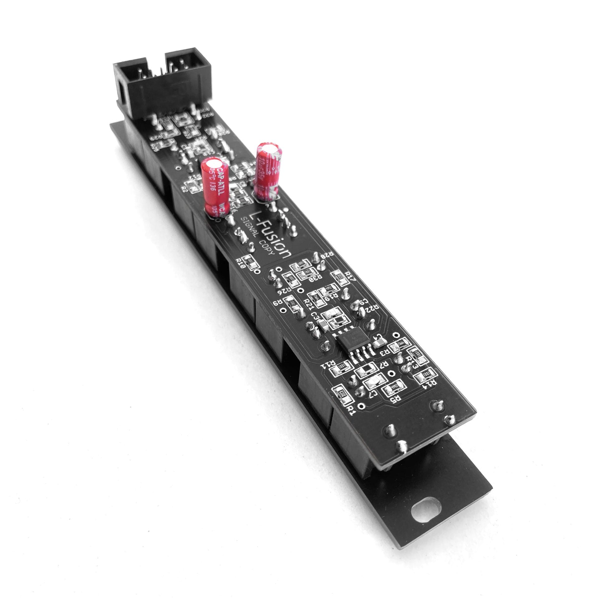Very compact active quad buffered mult module designed on a single PCB. Module features 4 low noise -1 to 3 signal multiple channels with 0.1% gain precision and very small offset suitable for both audio and CV.